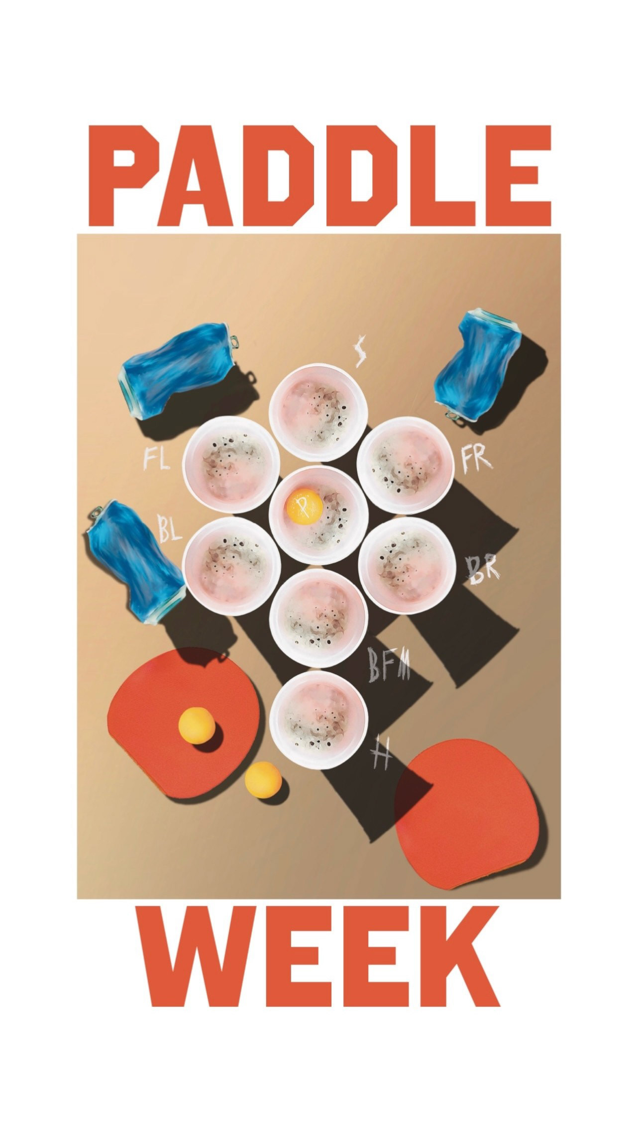 Minimalist, collegiate-inspired typographic poster depicting the popular drinking game Paddle, featuring a stylized overhead still-life with hard-shadow lighting.