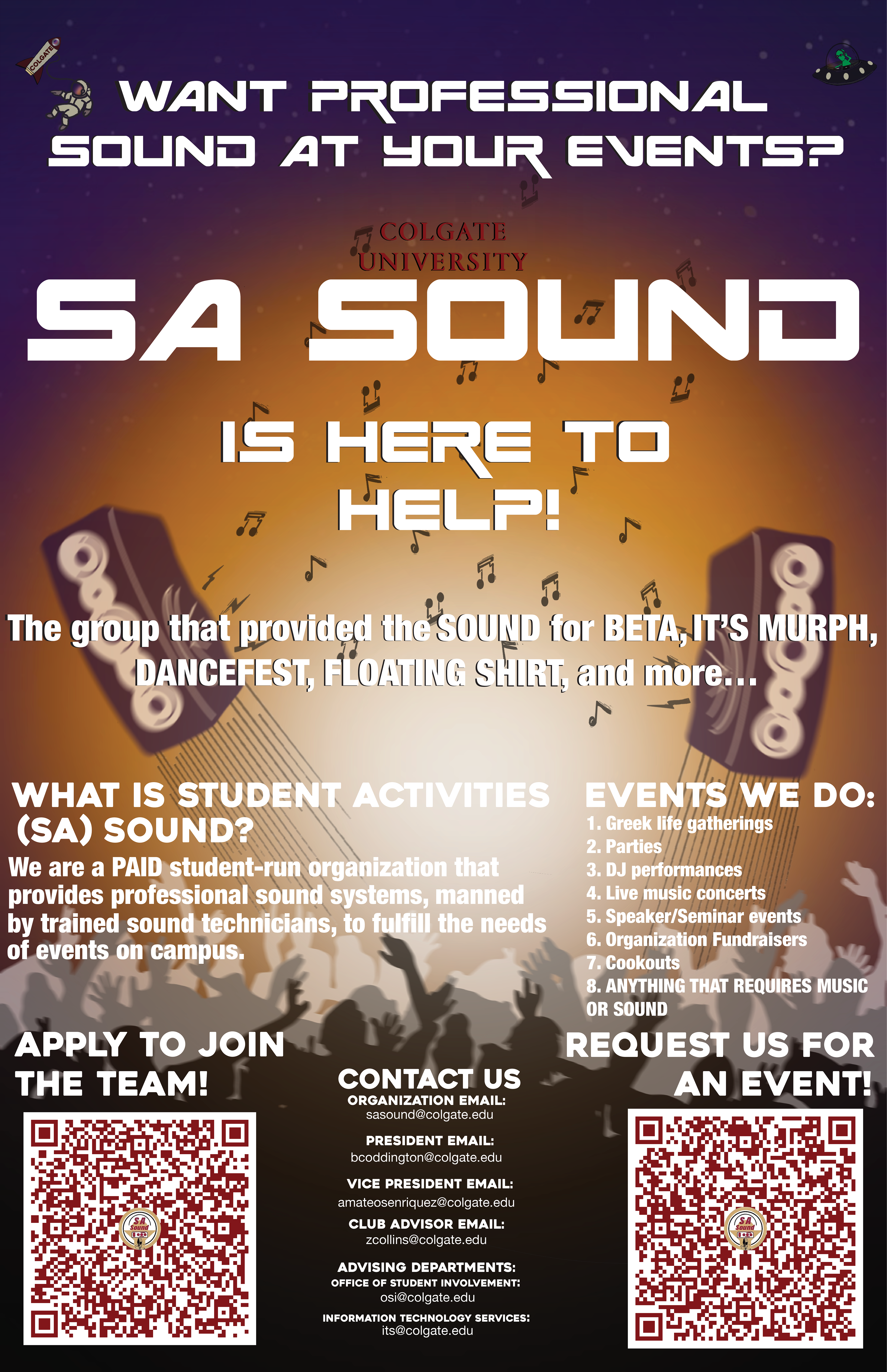 A marketing poster for Student Activities Sound, a Colgate University student organization that I served as president of during my time there.