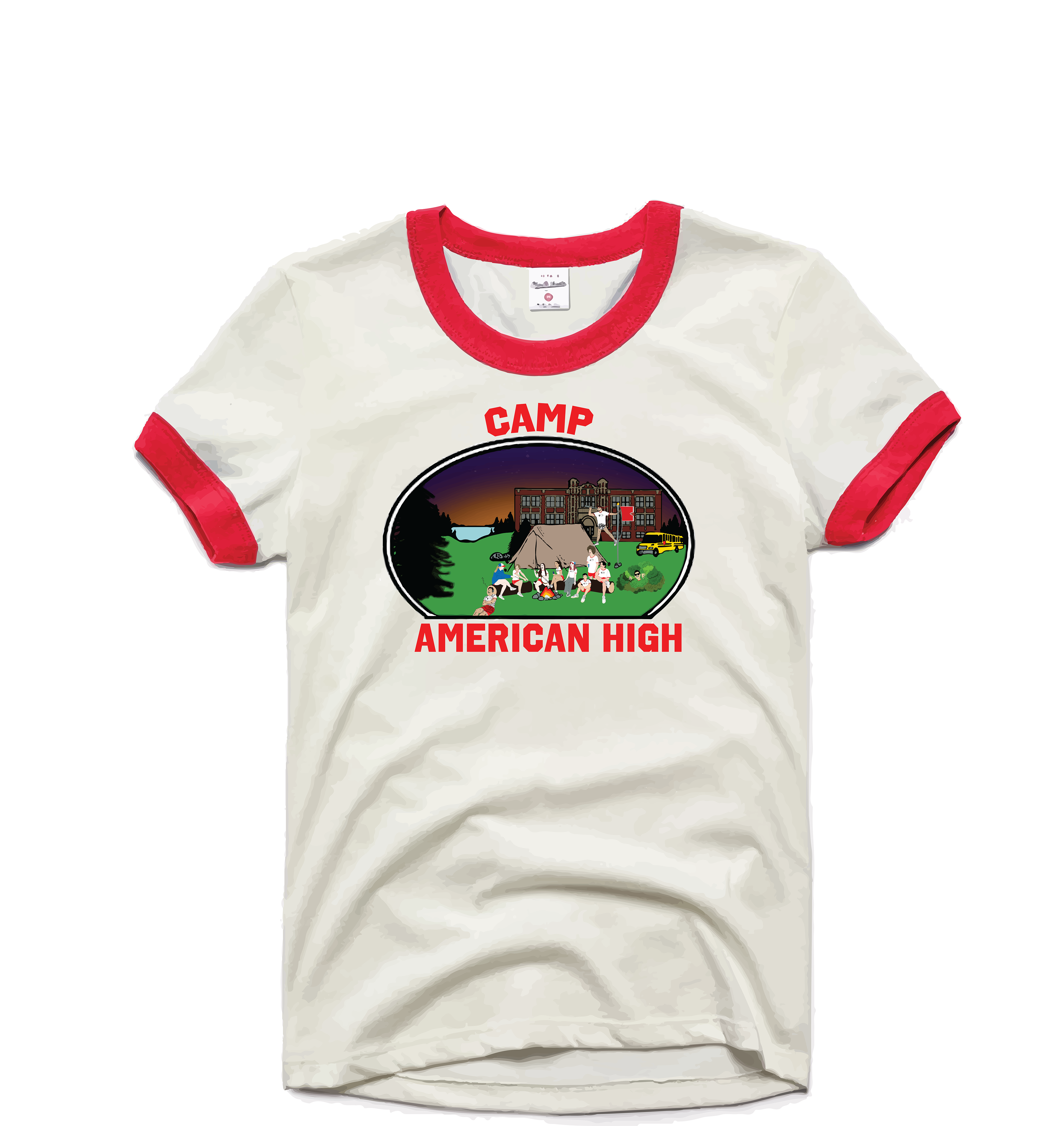 A graphic for the American High Summer 2024 Interns ringer tees. The artwork depicts each of us sitting around a campfire, with the school in the background.